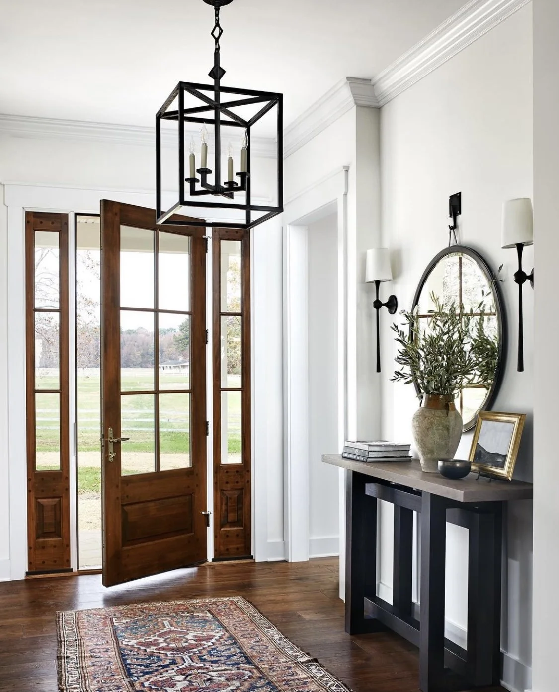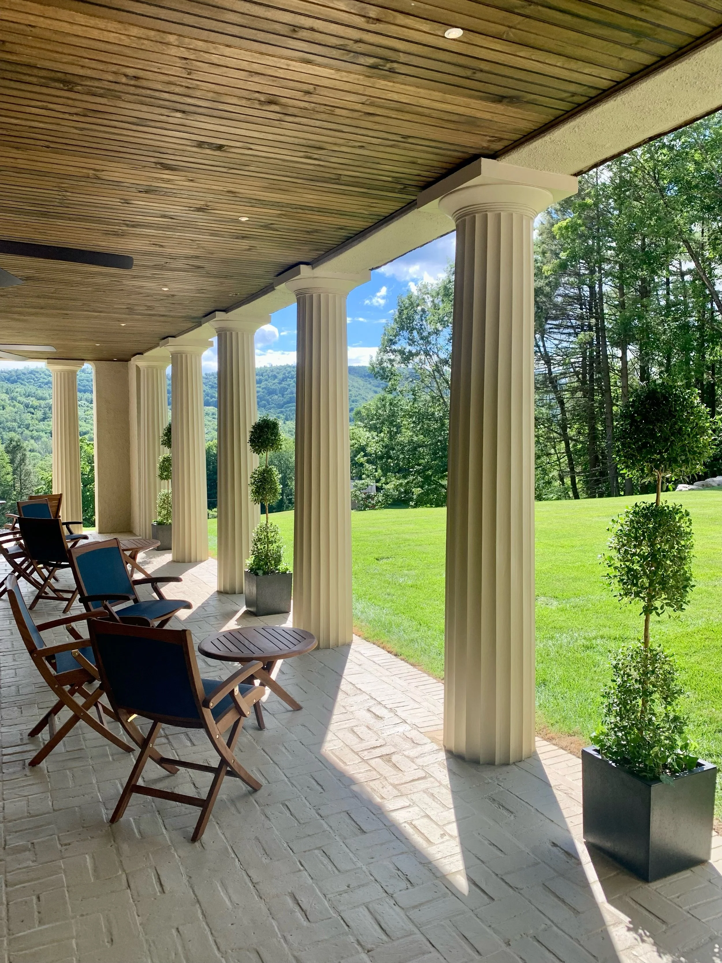 The portico at Winbrooke - Tyrignham, Massachusetts. Furniture by Jensen. Topiaries by Township Four Floristry & Home.